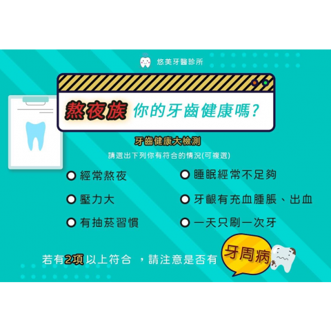 你是夜貓族嗎? 大家都說熬夜對身體不好 沒想到熬夜竟然也會對牙齒造成影響 快來檢測你是不是高風險牙周病族群 若發現有不適症狀一定要立即找牙醫檢查 才能及早治療 千萬不要輕忽身體的警訊阿